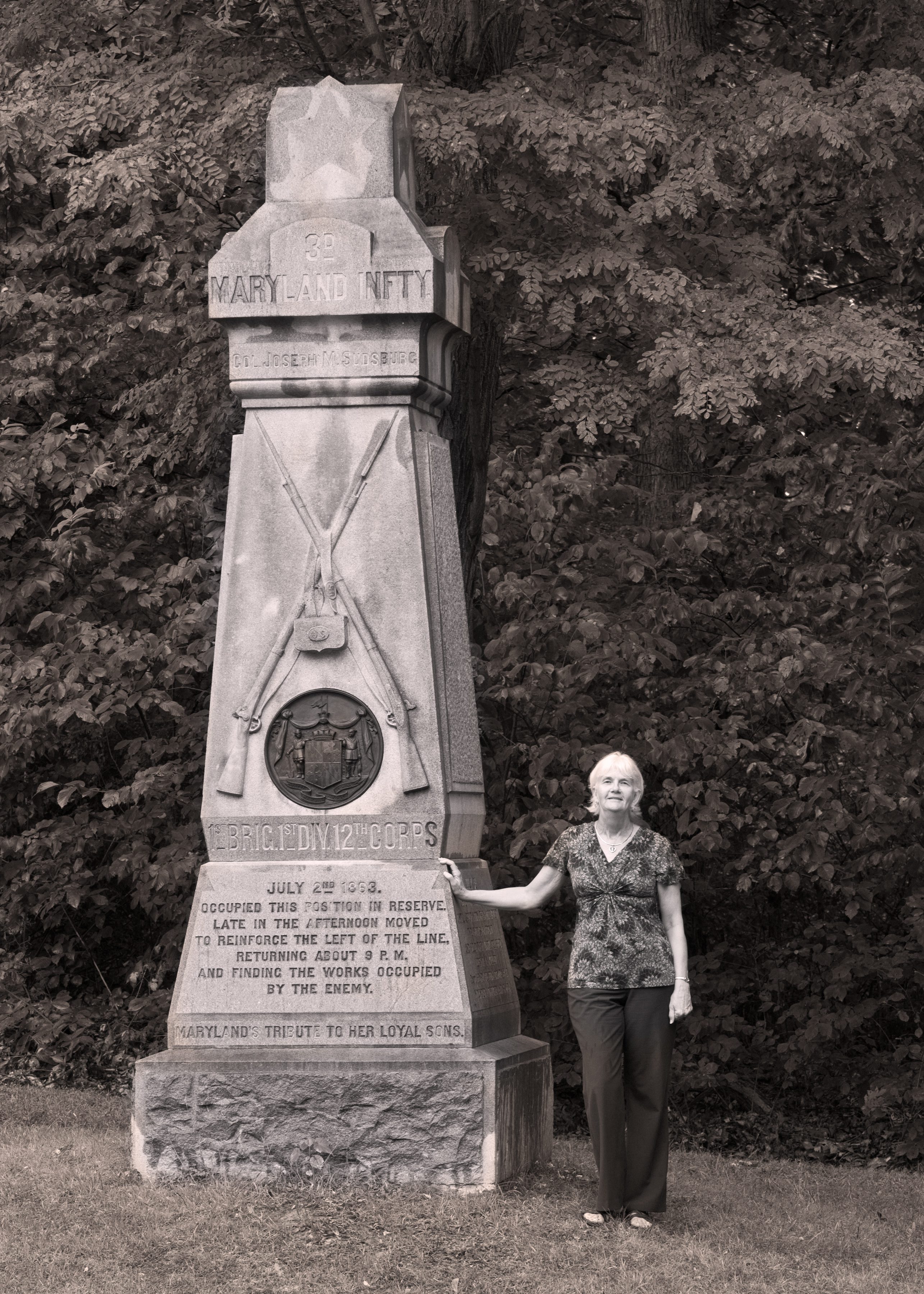 Fifty years after the fact, Terri’s great-great grandfather, Frank, attended the anniversary of the battle, searched out the historical marker designating his old unit’s location, and had his portrait made standing there, hand upon the stone, linking him backwards to those three awful days, 50 years before.